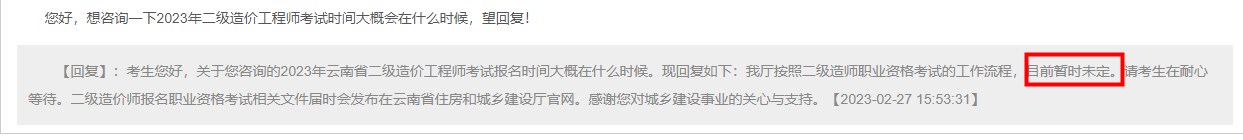云南省22年二級造價師補考順利結(jié)束,23年考試時間在什么時候?近日,有考生就23年二造考試時間的問題詢問了云南省住建廳,得到的回復(fù)如下。