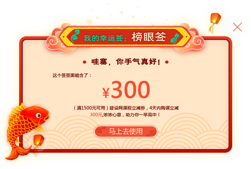 親愛的,在活動(dòng)時(shí)間內(nèi)點(diǎn)擊【抽簽】可立刻抽取你的幸運(yùn)簽,每種簽代表的是一種祝福和相應(yīng)金額的一建課程優(yōu)惠券或免費(fèi)課。已經(jīng)抽到的簽可點(diǎn)【我的】查看。