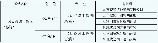 咨詢工程師(投資)職業(yè)資格考試設(shè):《宏觀經(jīng)濟政策與發(fā)展規(guī)劃》、《工程項目組織與管理》、《項目決策分析與評價》、《現(xiàn)代咨詢方法與實務(wù)》4個科目。