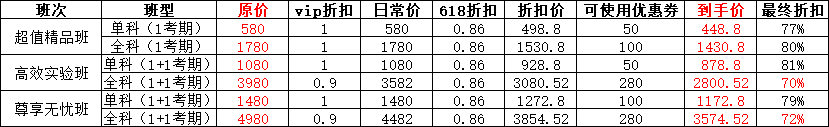 只要你搶到了1元優(yōu)惠券包,那么就可以用如下表格所示“到手價(jià)”的價(jià)格購(gòu)入咨詢課程,低至7折,購(gòu)買高效和無(wú)憂全科性價(jià)比超高的哦!