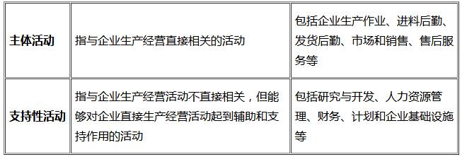 企業(yè)的利潤或者價值創(chuàng)造的過程是由一系列的經(jīng)營管理活動構(gòu)成的。企業(yè)要生存和發(fā)展,必須為企業(yè)的股東和其他利益集團包括員工、顧客、供貨商以及所在地區(qū)和相關(guān)行業(yè)等創(chuàng)造價值,可以把企業(yè)創(chuàng)造價值的過程分解為一系列互不相同但又相互關(guān)聯(lián)的經(jīng)濟活動,這些活動可以分為主體活動和支持性活動兩大類: