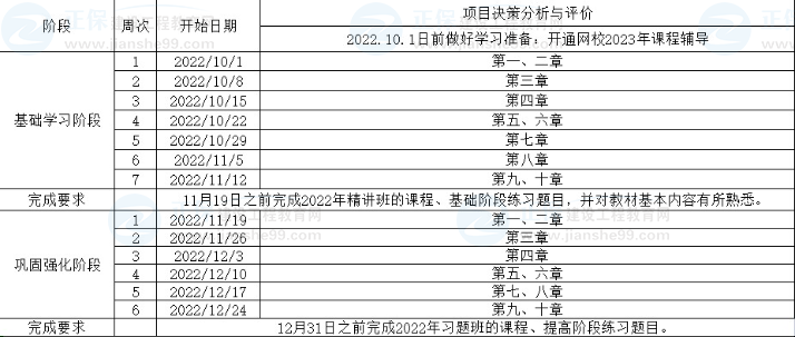 1、整體進(jìn)度說明:本計劃表從2022年10月1日開始執(zhí)行,計劃于2022年12月31日結(jié)束,共計13周;其中:基礎(chǔ)學(xué)習(xí)階段安排7周,鞏固強(qiáng)化階段安排6周。學(xué)員可根據(jù)本表的提示,結(jié)合自己的工作,學(xué)習(xí)情況進(jìn)行細(xì)化,并按網(wǎng)校要求完成聽課、做題的學(xué)習(xí)任務(wù),基本可滿足考試需要。