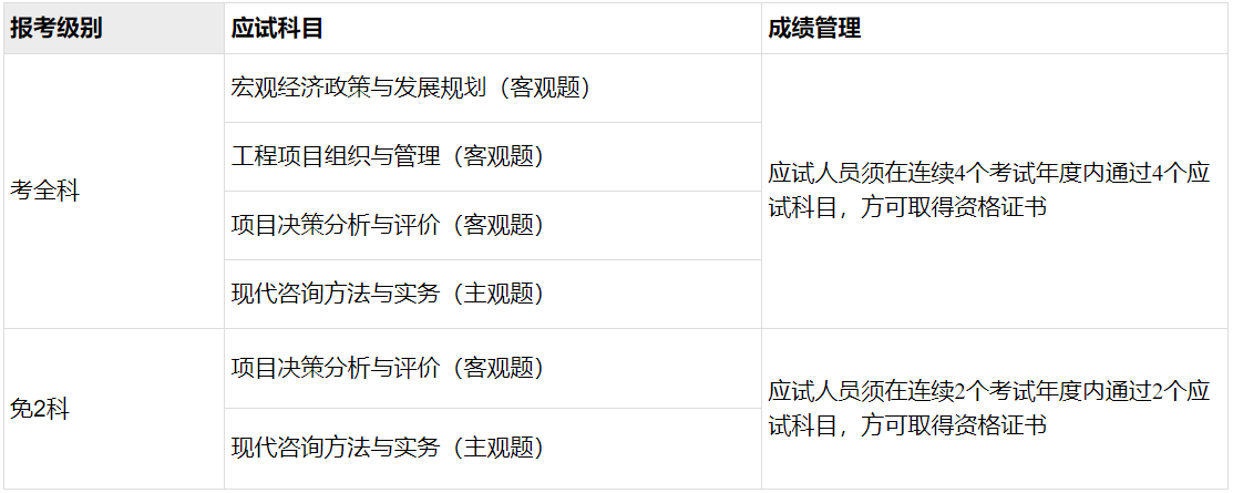 上述人員可免試部分科目,只參加《項目決策分析與評價》和《現(xiàn)代咨詢方法與實務》2個科目的考試。