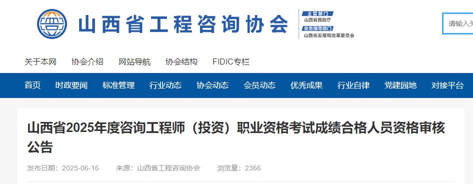 山西省工程咨詢協(xié)會發(fā)布山西省2025年度咨詢工程師(投資)職業(yè)資格考試成績合格人員資格審核公告,具體信息如下: