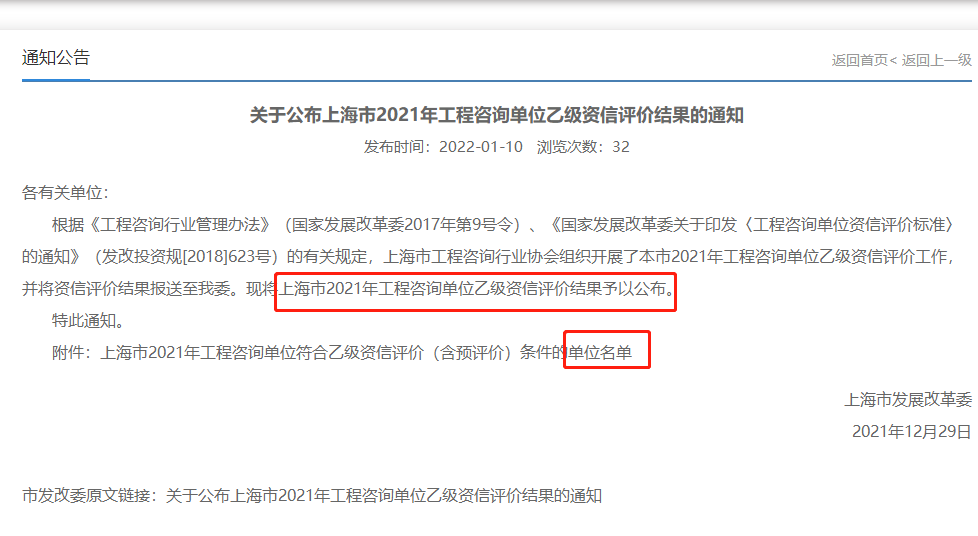 市發(fā)改委原文鏈接:關(guān)于公布上海市2021年工程咨詢單位乙級資信評價結(jié)果的通知